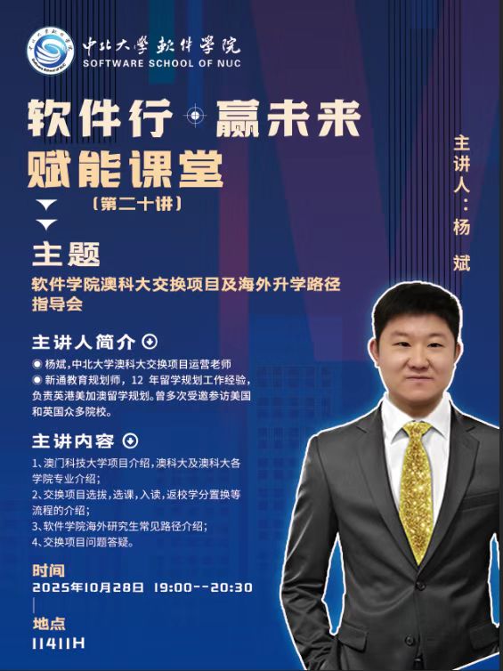 依托“软件行·赢未来”赋能课堂品牌,于10月28日晚在11411H教室成功举办了澳门科技大学交换项目宣讲暨海外升学路径指导会,吸引了时时彩投注购买平台百余名有国际发展意向的学生踊跃参与。